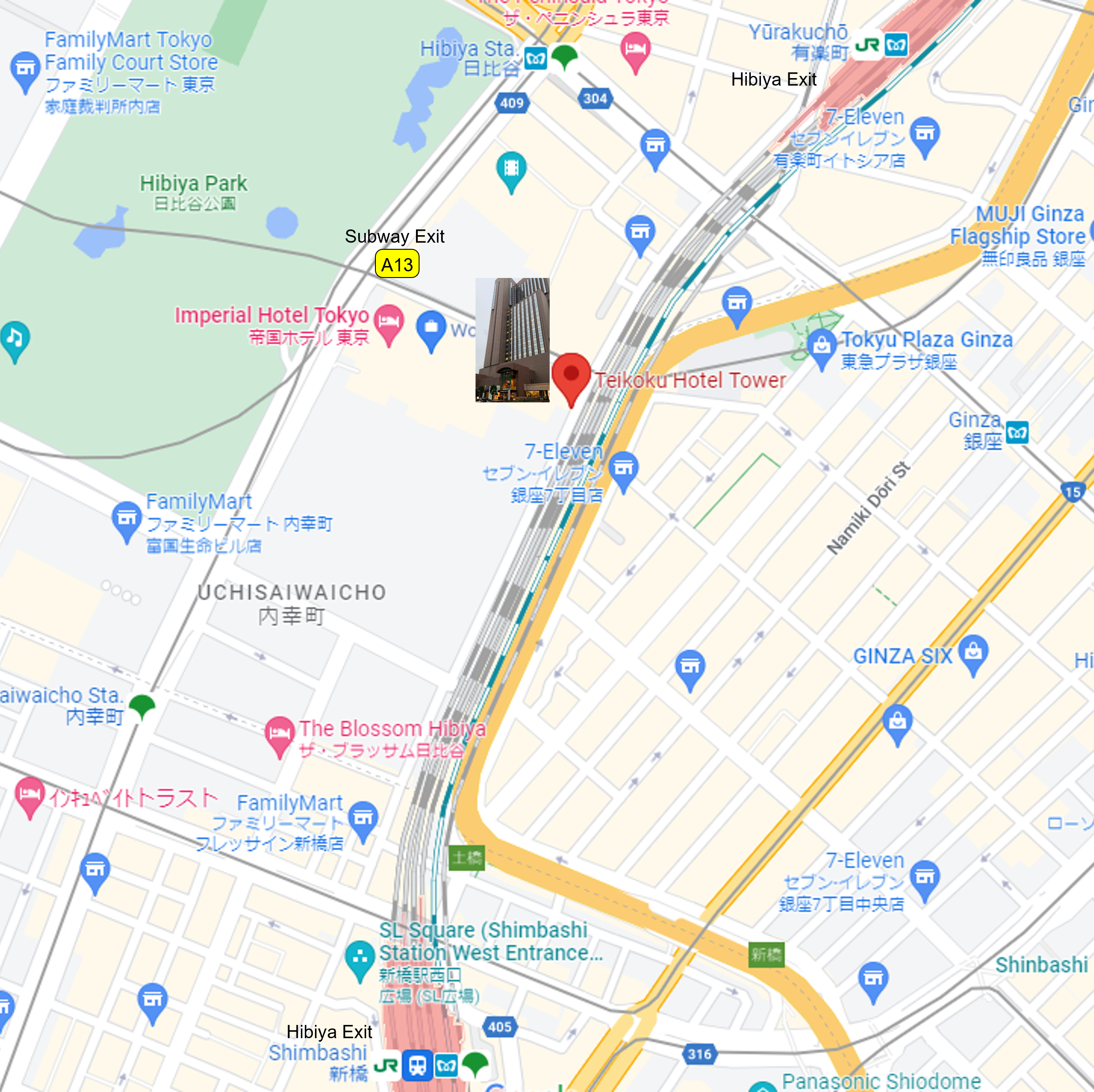 • From JR Shinbashi station (Hibiya exit) approx. 7 minutes walking distance.